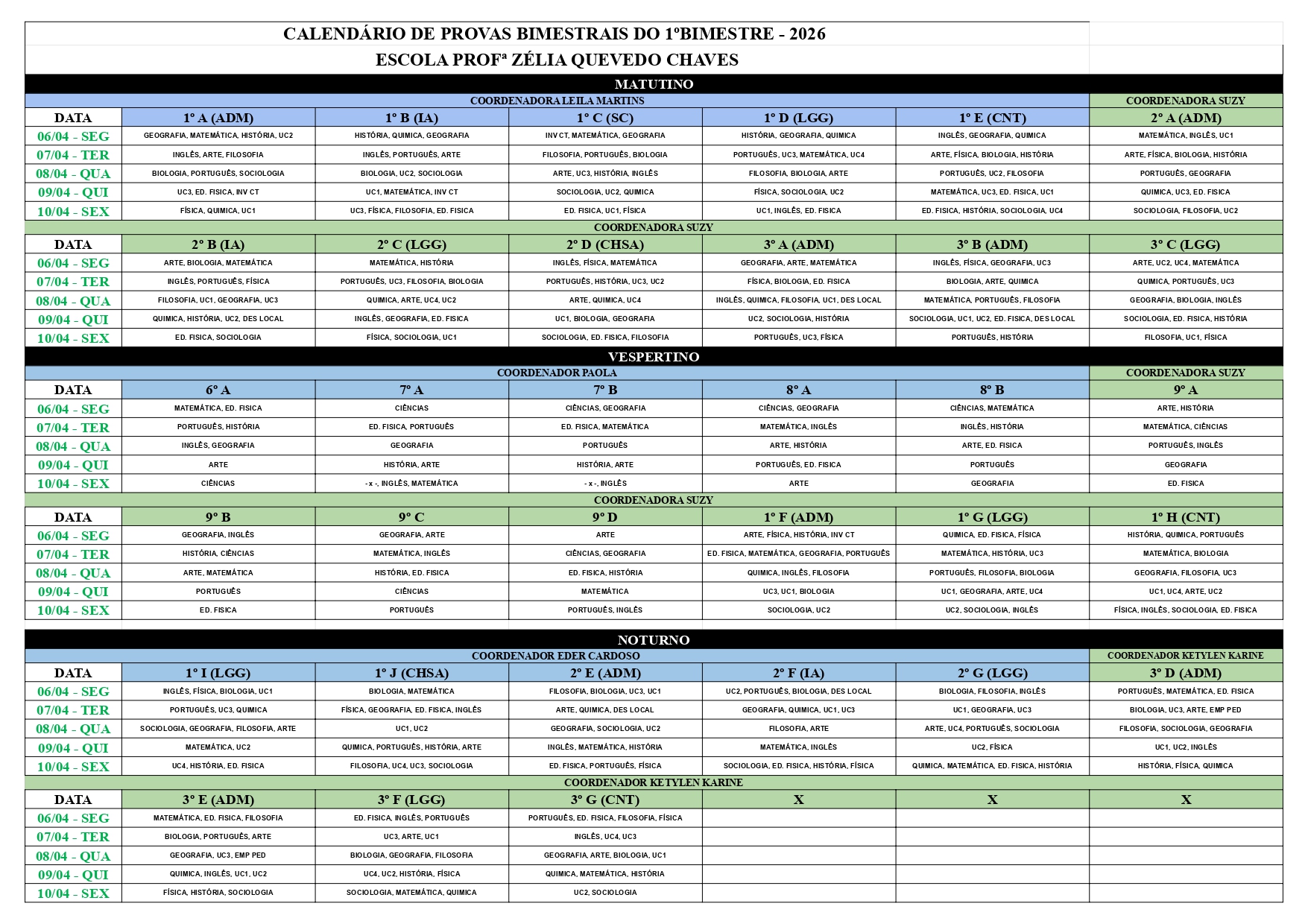 CALENDÁRIO DAS PROVAS BIMESTRAIS DO 1º BIMESTRE 2026