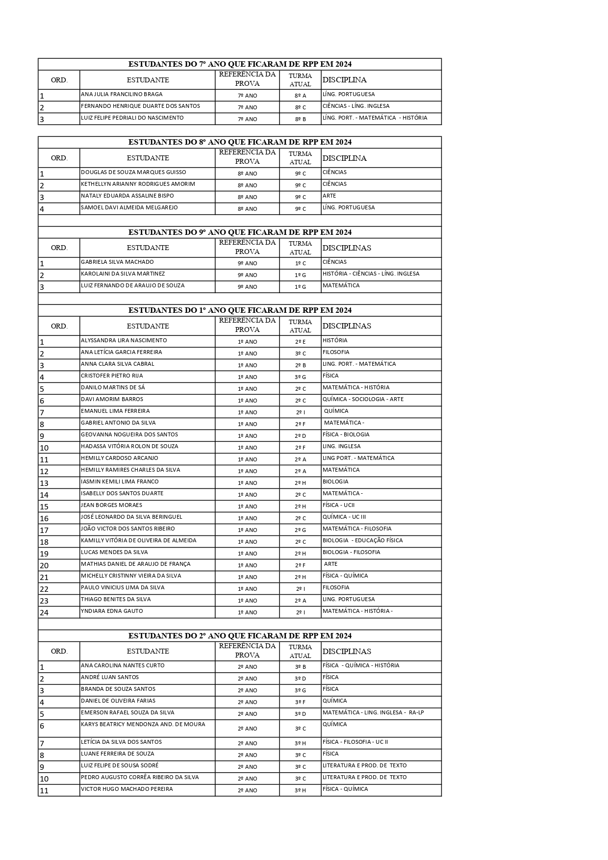 RELAÇÃO DOS ALUNOS QUE ESTÃO DE RPP