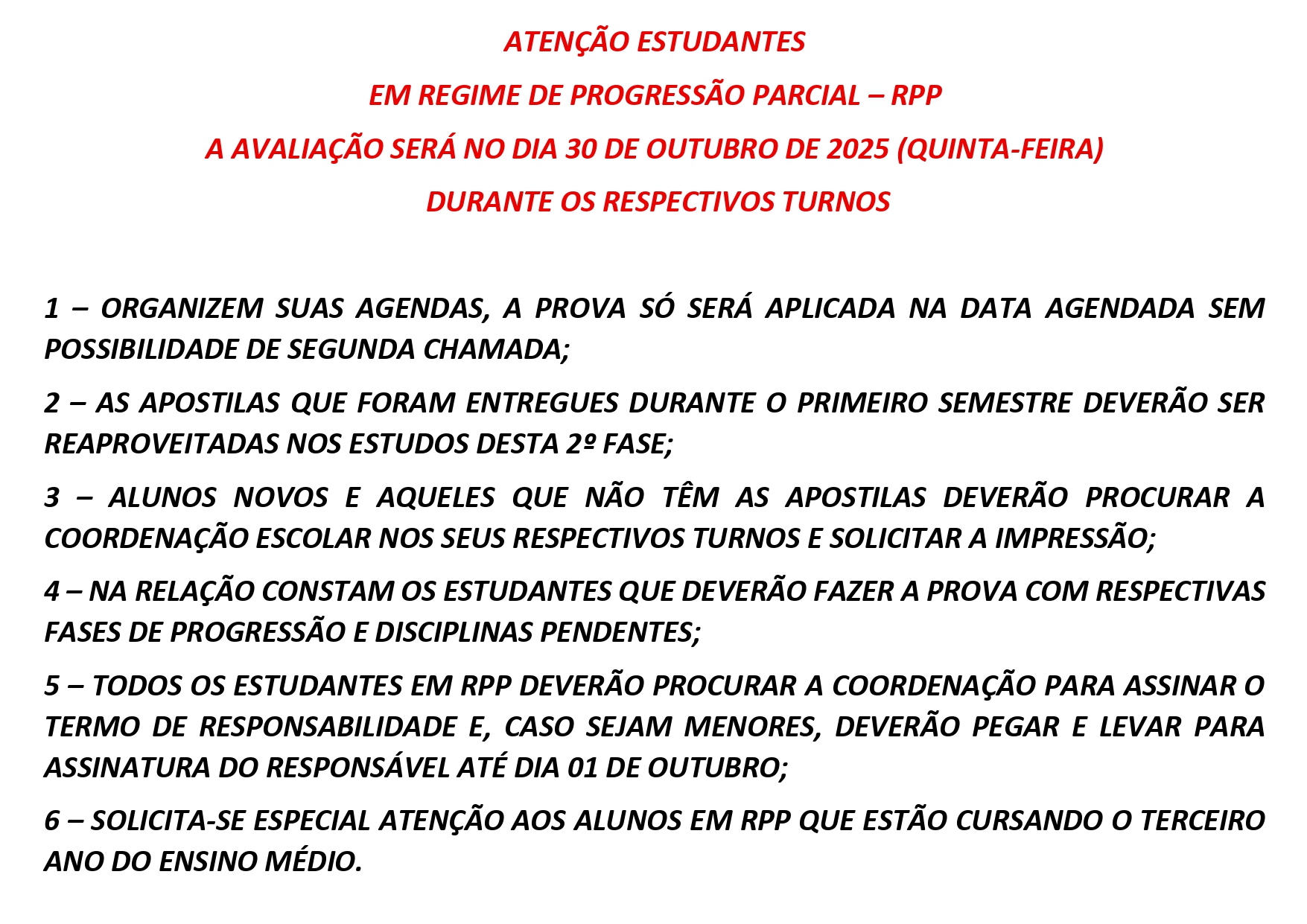 QUEM ESTIVER EM REGIME DE PROGRESSÃO PARCIAL RPP - 2024 DEVERÁ REALIZAR A AVALIAÇÃO ACONTECERÁ NO DIA 29 DE MAIO DE 2024 NOS SEUS RESPECTIVOS PERÍODOS