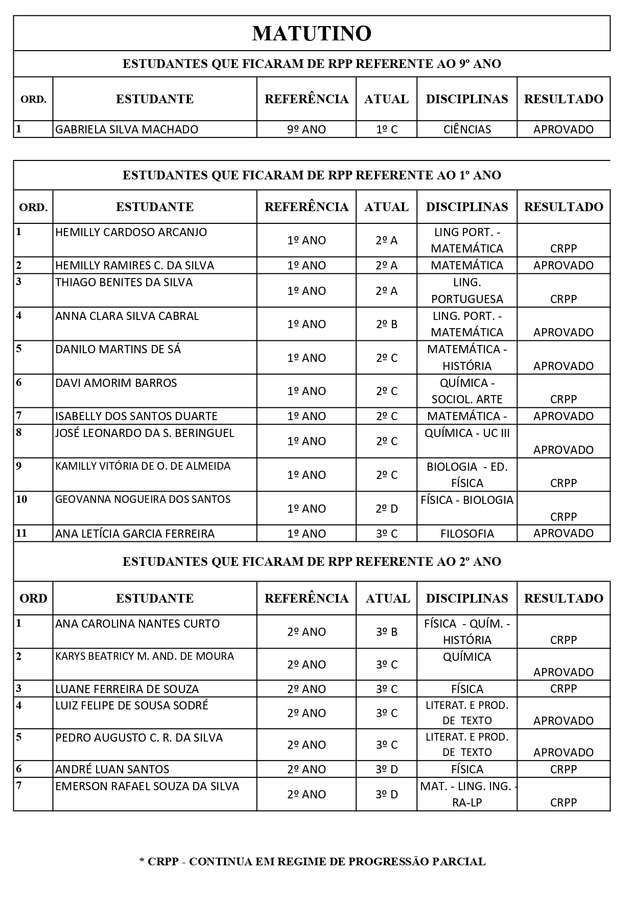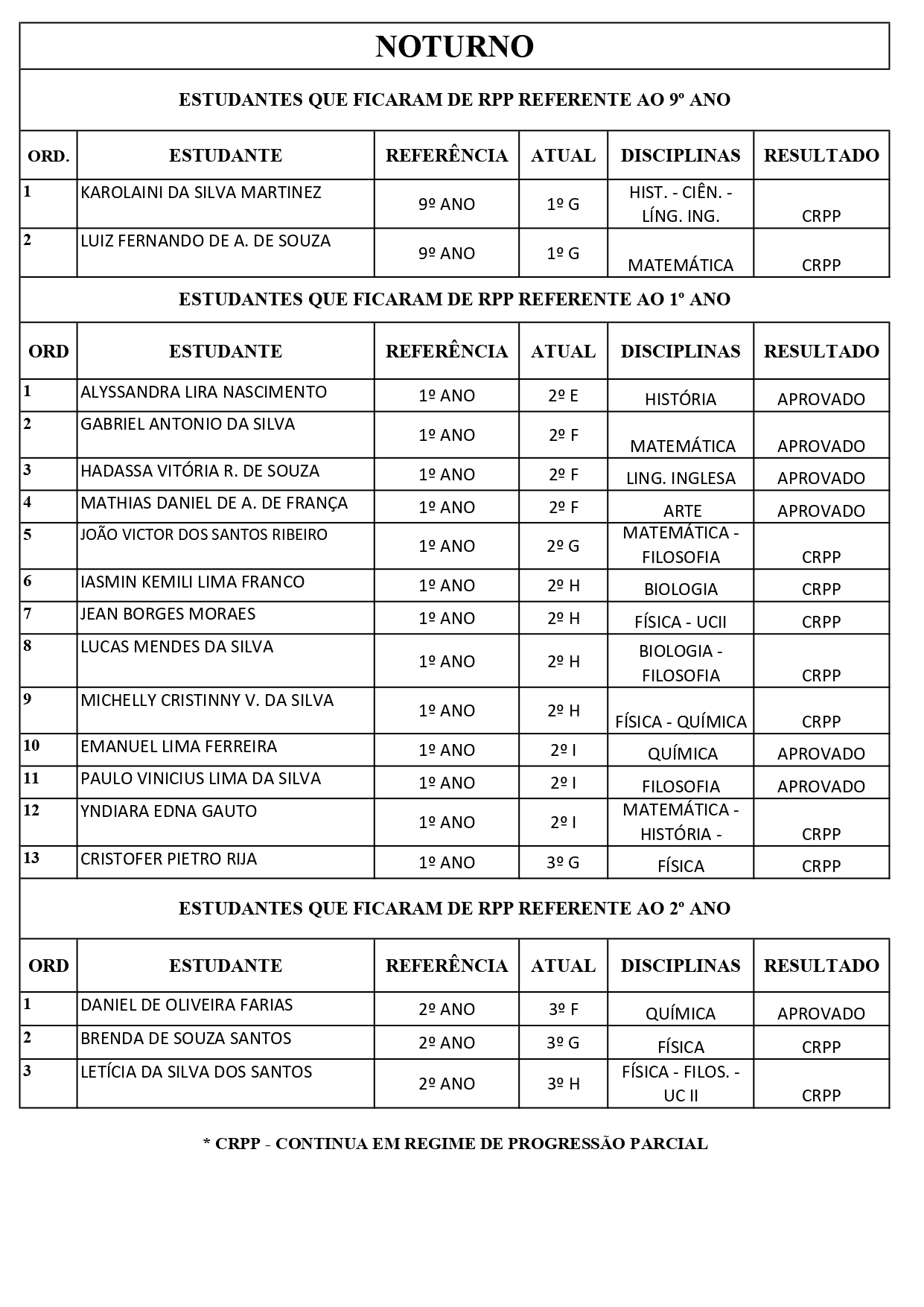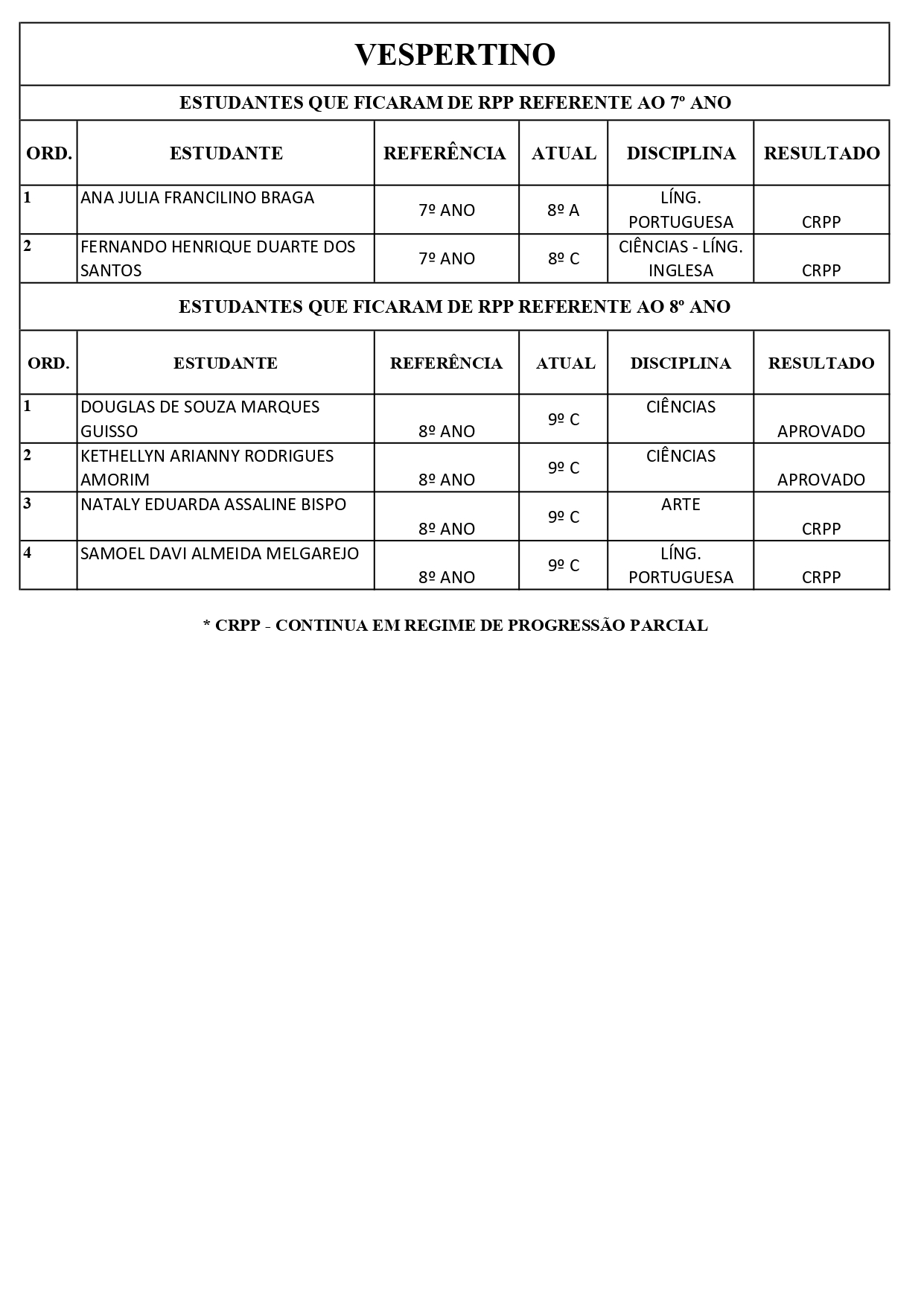 RESULTADO DAS PROVAS DA RPP - Regime de Progressão Parcial